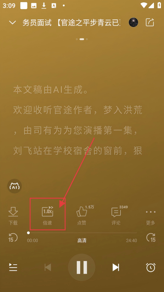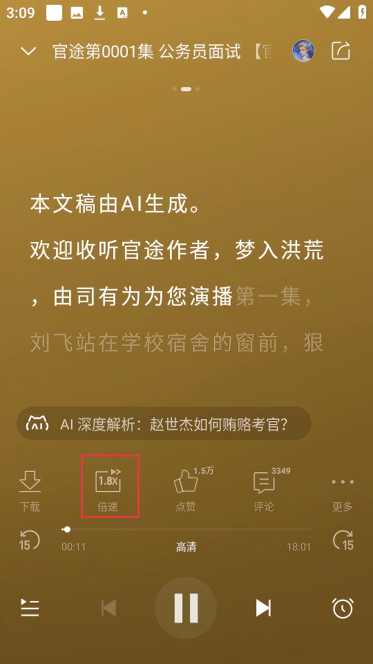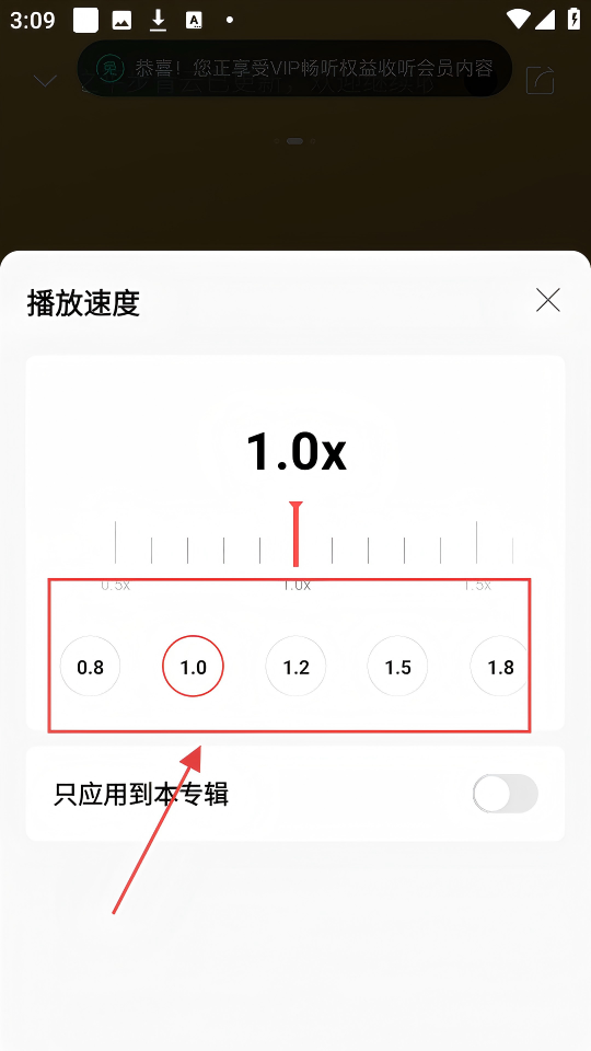 4、选择好速度,比如【1.8x】,就能以该倍速收听音频,超方便的哟。