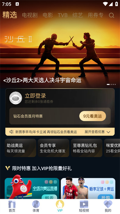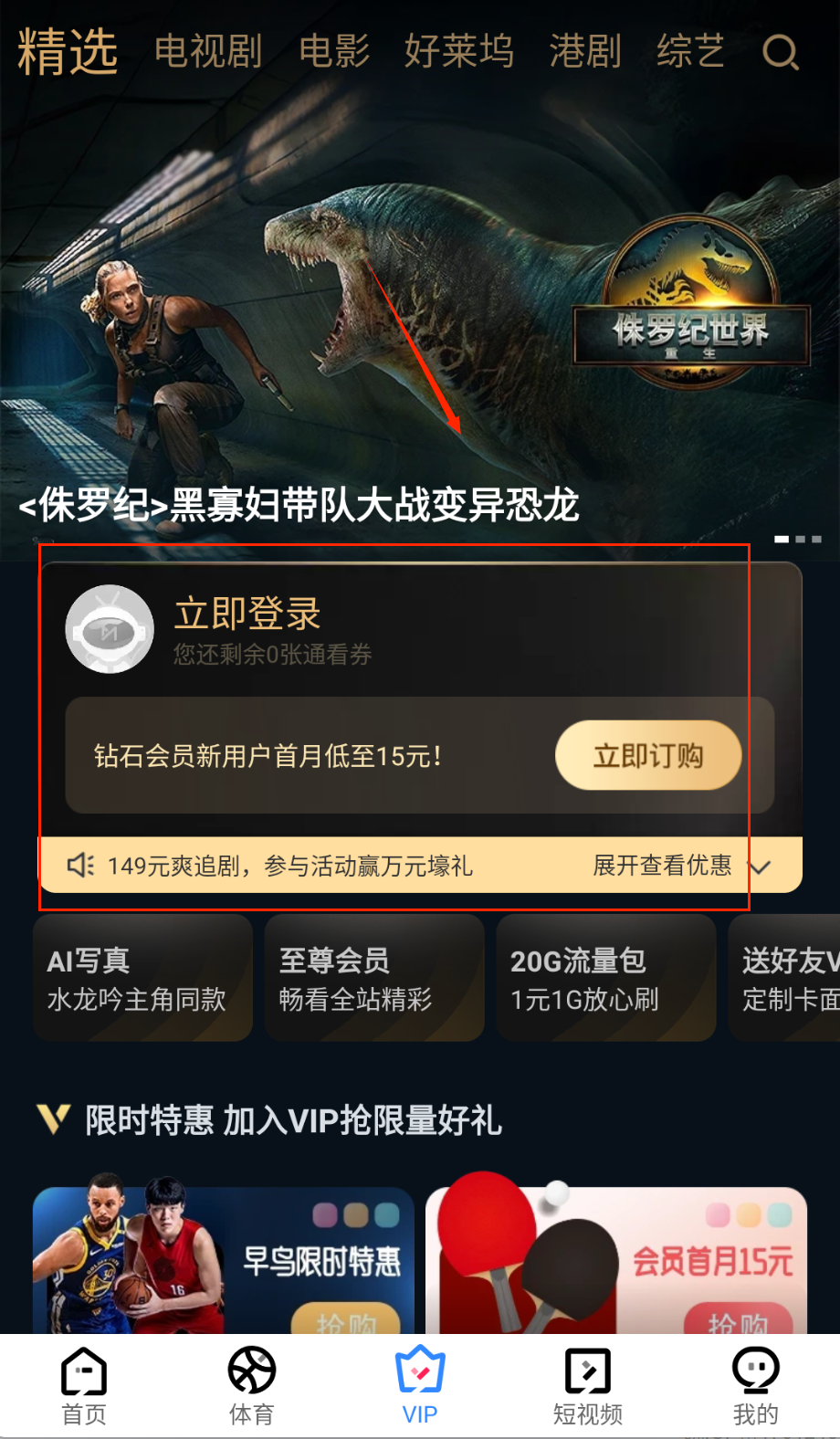 1、追剧党可以从首页进入“VIP”板块,这里有好莱坞、港剧等分类,开通钻石会员能免费看《水龙吟》,用通看券还能解锁更多独播剧呀。