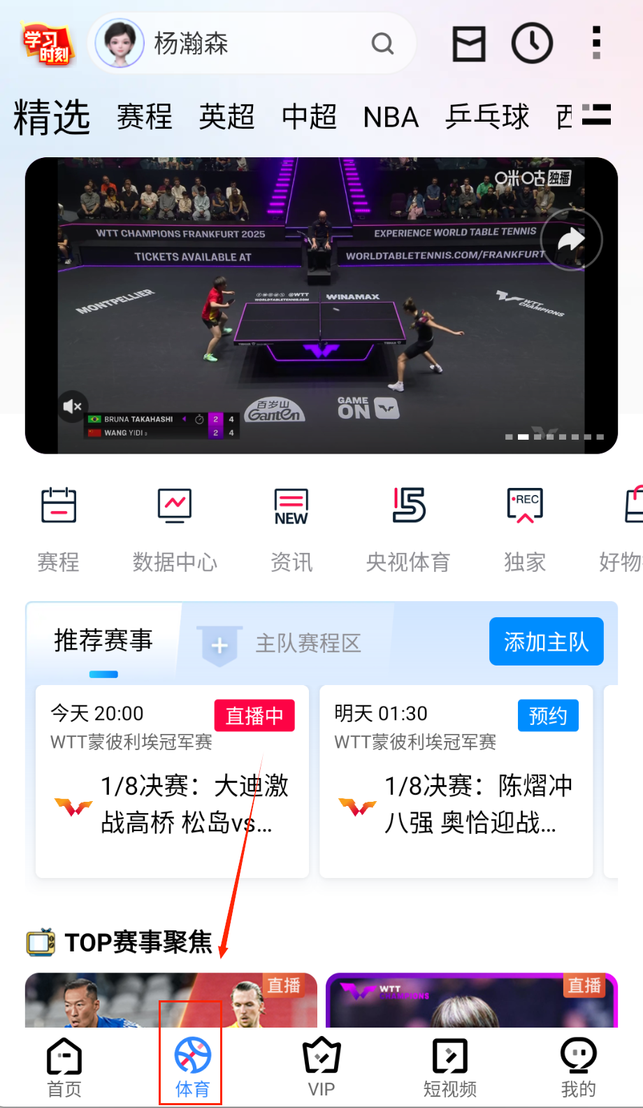 2、体育迷直接点底部“体育”标签,页面顶部有英超、NBA等分类,直播中的赛事会标红显示,比如中超海港对浙江的比赛。