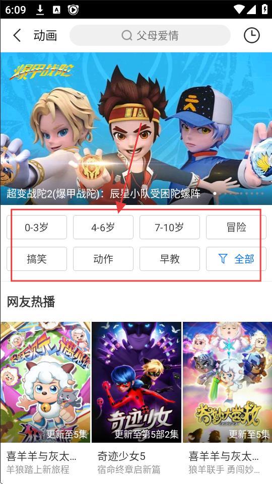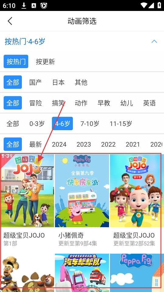 2、在动画页面,有【0-3岁】【4-6岁】等年龄分类,选合适的,进入筛选后的动画列表。