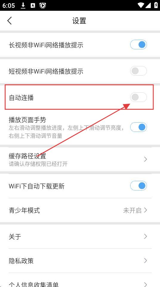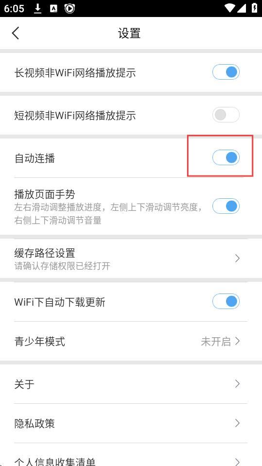3、进入设置页面,若想开启自动连播,找到【自动连播】选项,点击其开关,即可尝试开启操作啦。