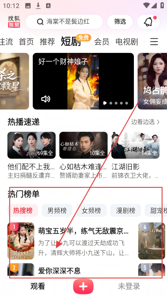 1、在搜狐视频主界面,找到【热门榜单】,从中挑选感兴趣的短剧,点击即可进入观看啦。