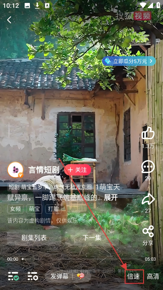 2、进入短剧播放页面后,点击界面下方的【倍速】按钮,就能打开倍速选择界面哟。