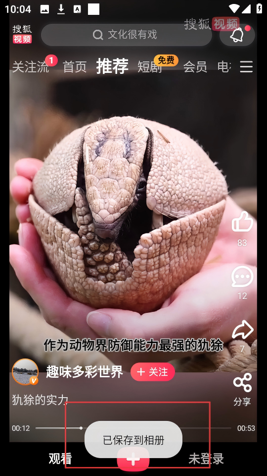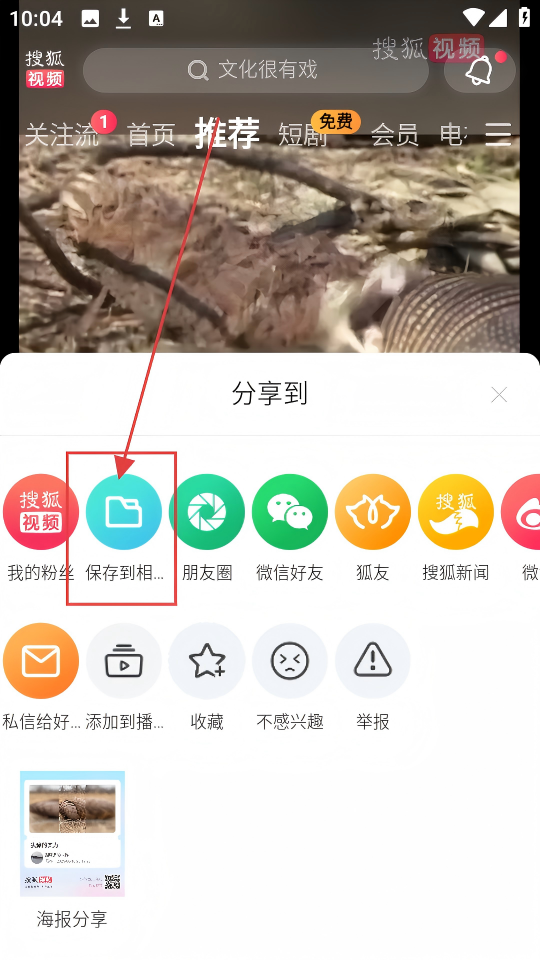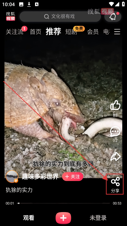 1、在搜狐视频看到有趣视频,点击右侧【分享】按钮,打开分享选项界面。