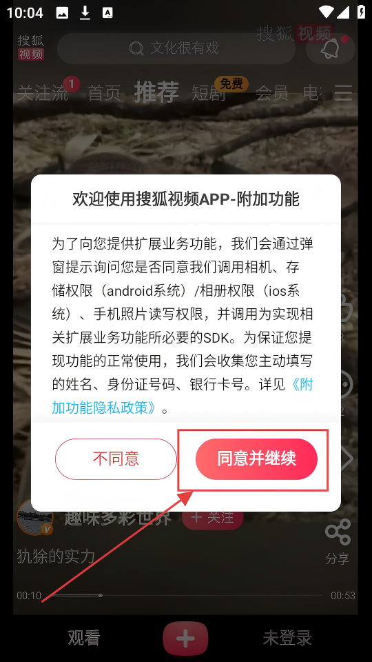 3、弹出权限申请弹窗后,点击【同意并继续】,授予搜狐视频相关权限。