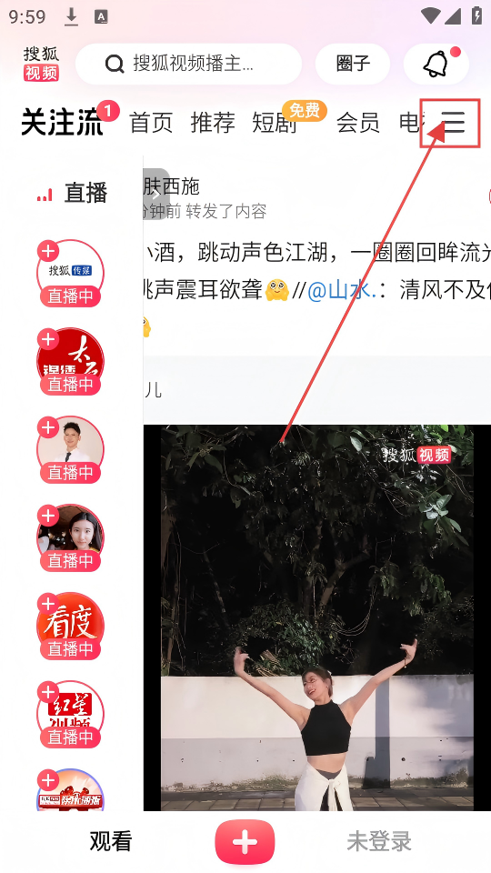 1、在搜狐视频主界面,点击右上角的菜单按钮,展开频道选择界面。