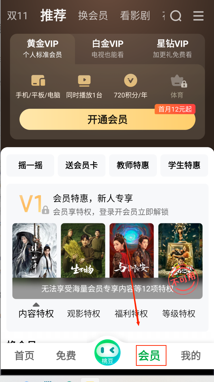 3、会员特权包含内容观看、观影特效等12项权益,未登录时会提示"无法享受会员特权",记得先登录再开通啦。