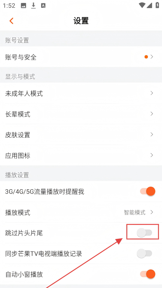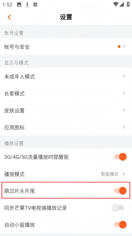 3、在设置界面,找到【跳过片头片尾】选项,开启它,看剧时能直接进入正片,超赞的。