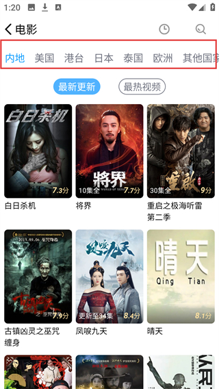 3、在电影分类页面,可选择不同地区的电影,如内地、美国等,点击地区标签,可筛选出对应地区的电影啦。