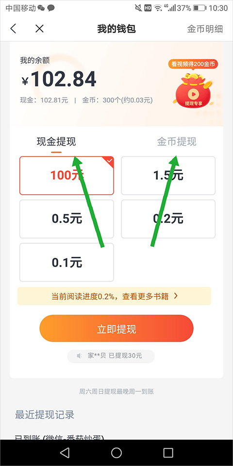 3、其中现金提现还是通过看小说的方式去提现,其中0.3元和1元提现需要阅读小说20分钟,其他的提现需要阅读小说40分钟。每天只能提现一次,提现金额会在1-3个工作日内到账,周六周日会有延迟情况!