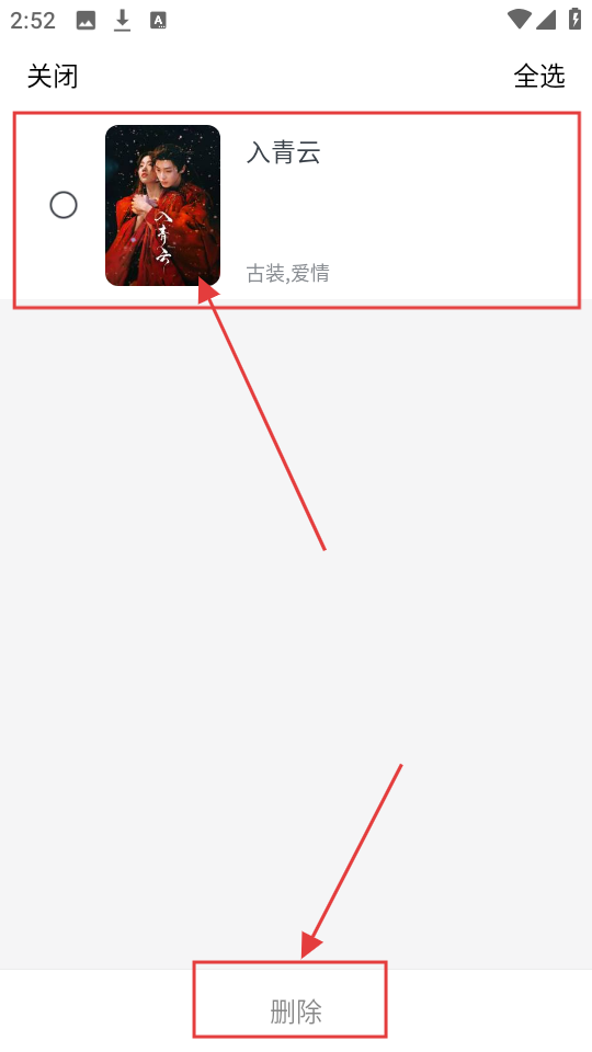 3、在历史记录管理页面,选择要删除的视频,比如【入青云】,点击【删除】按钮呢。