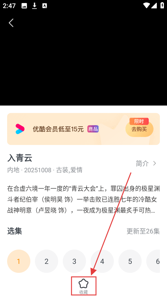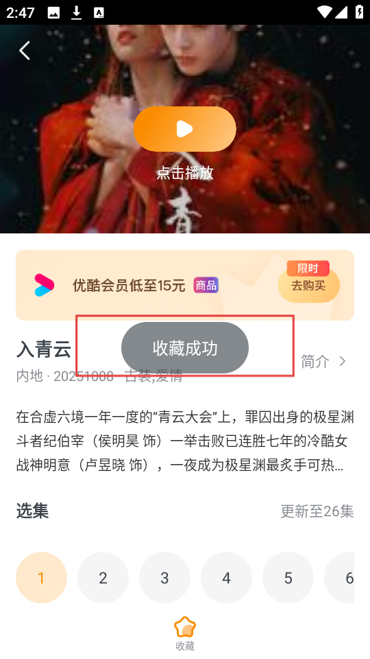 2、进入剧集详情页后,点击下方【收藏】按钮,就能把这部剧收藏起来啦。