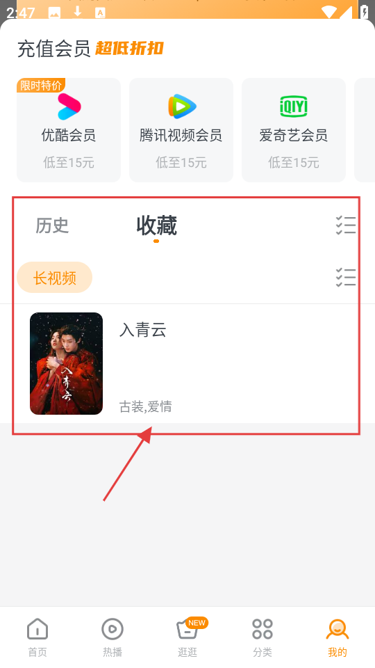4、想查看收藏的剧集,就点击【我的】,在【收藏】标签页里就能找到【入青云】啦。