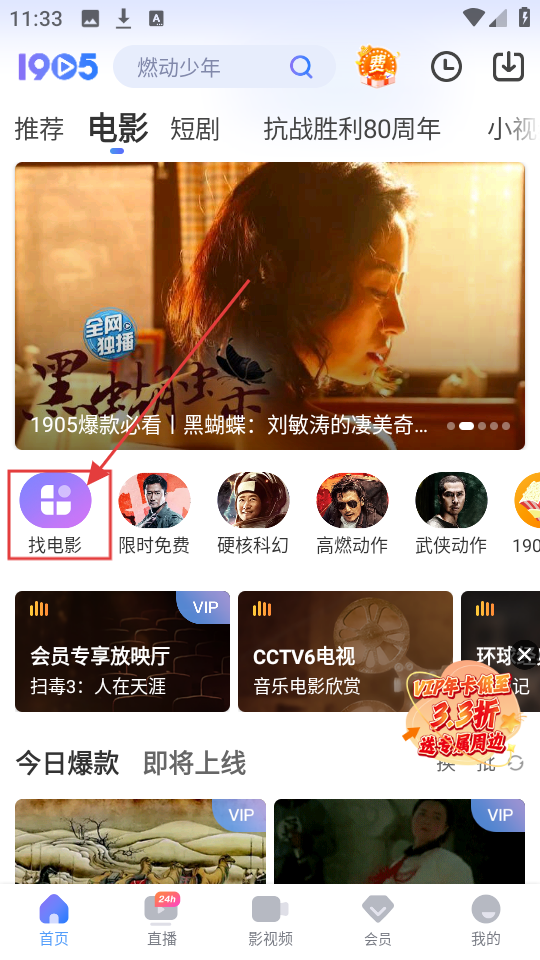 1、打开APP首页,点击【找电影】选项,进入电影查找页面,准备筛选电影啦。
