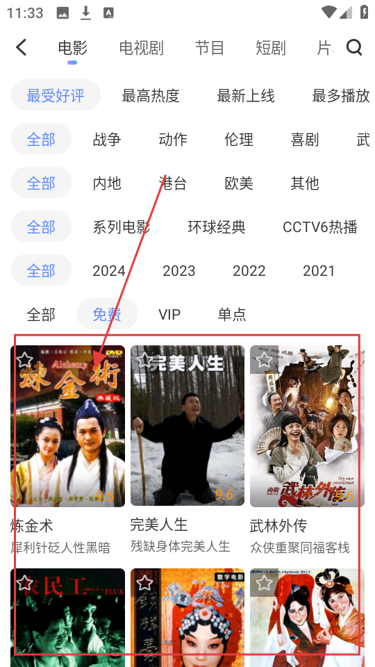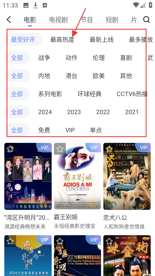 2、在电影查找页面,通过热度、类型、地区等条件筛选,找到符合需求的电影分类哦。