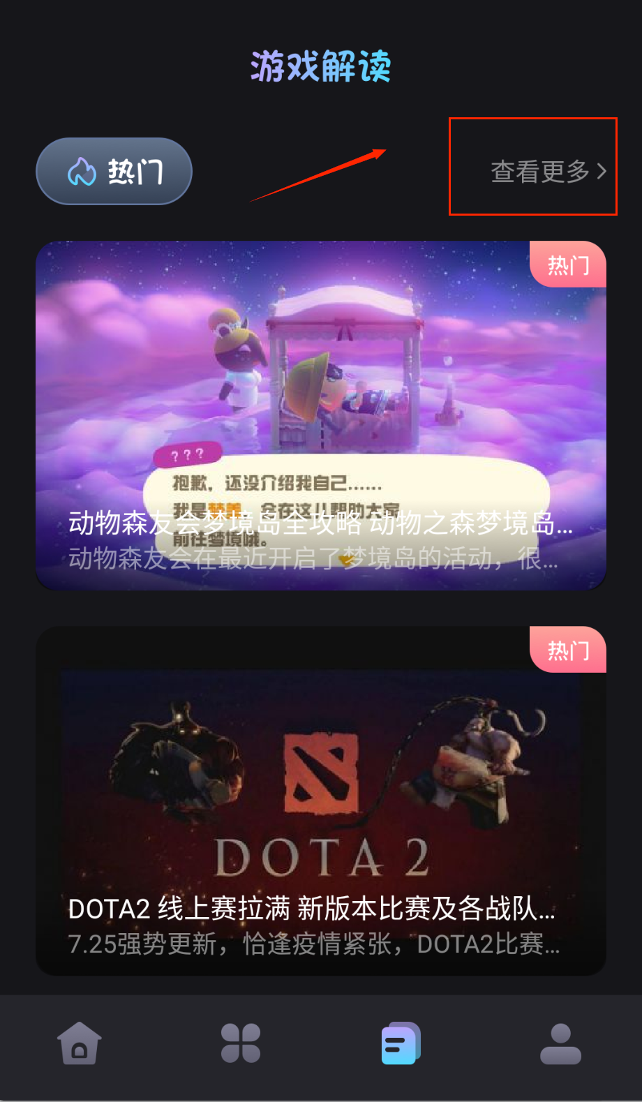1、在首页找到"游戏解读"板块,点击"热门"标签查看当前流行游戏内容,比如动物森友会梦境岛和DOTA2的最新资讯。