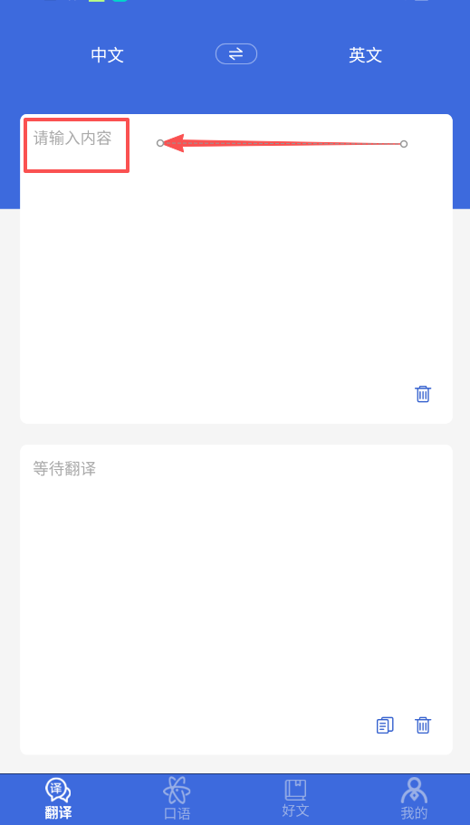 1、首先,你会在主页看到一个输入框,把你想查的词或句子输进去,点击翻译,就能得到结果了。