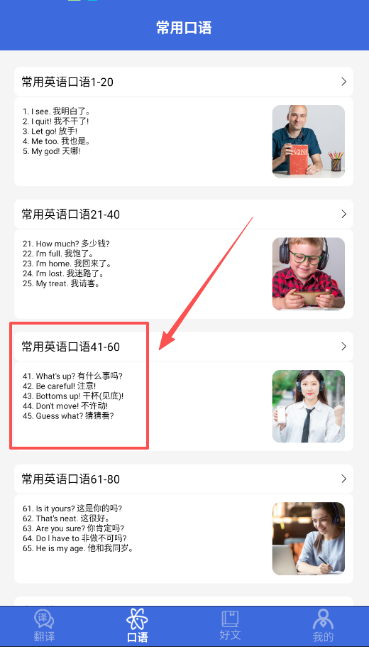 2、然后,你可以点开“口语”标签,里面像单词本一样列了很多日常对话句子,上下滑动就能一条条学习。