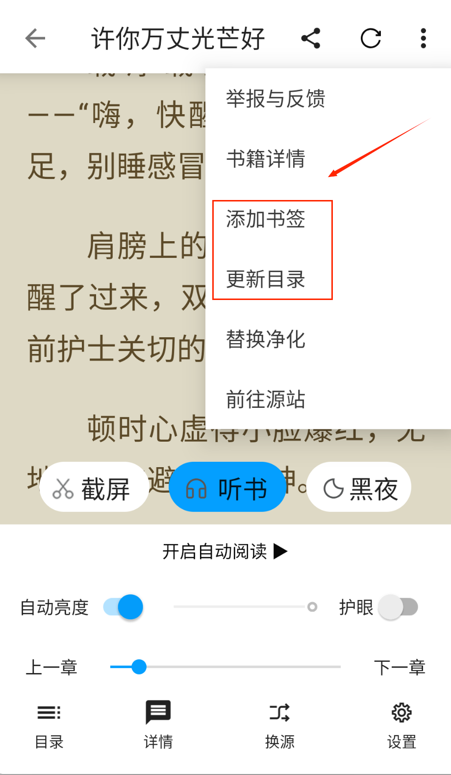 3、读到精彩处别忘了使用“添加书签”功能标记进度,您还可在“我的”页面中管理“同步云书架”。