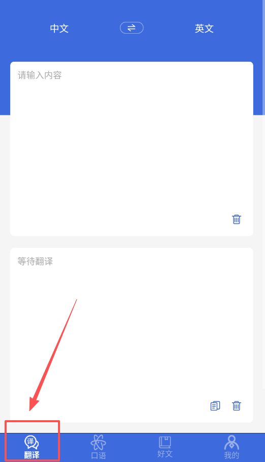 1、翻译功能很简单,在主页输入框里写上中文或英文,点一下翻译,结果马上就出来了,你可以直接复制使用。