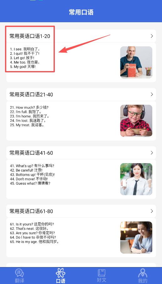 2、想练口语就点第二个标签,里面有整理好的常用句子,分成一小段一小段的,带着中文解释,看起来不费力。