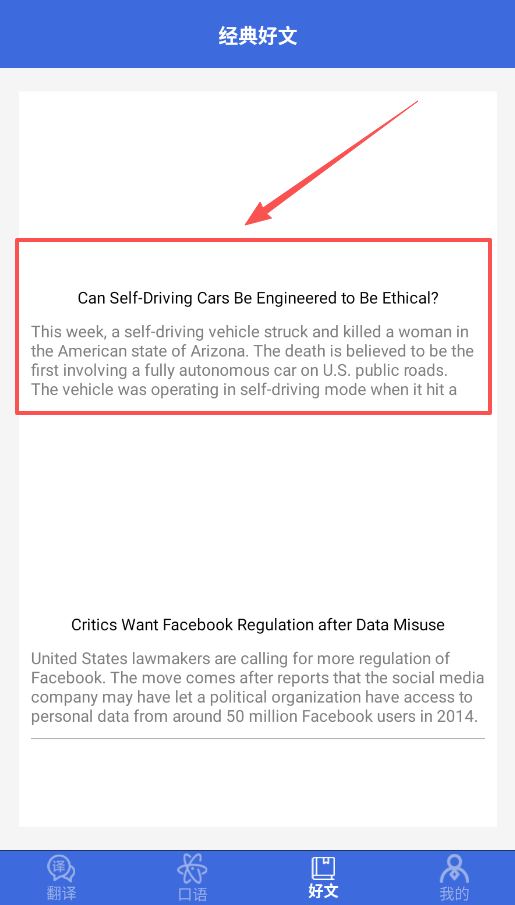 3、读文章点第三个标签,它会提供一些有趣的短篇英文新闻,既能看故事又能学单词,挺不错的。