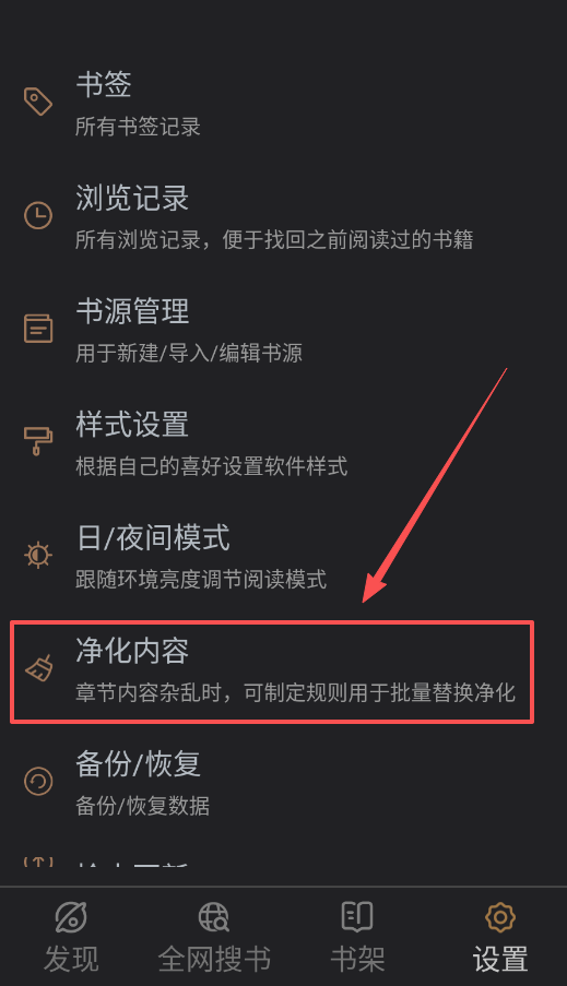 2、阅读时遇到排版混乱的问题,可以使用净化内容功能,通过设置替换规则来清理杂乱格式。
