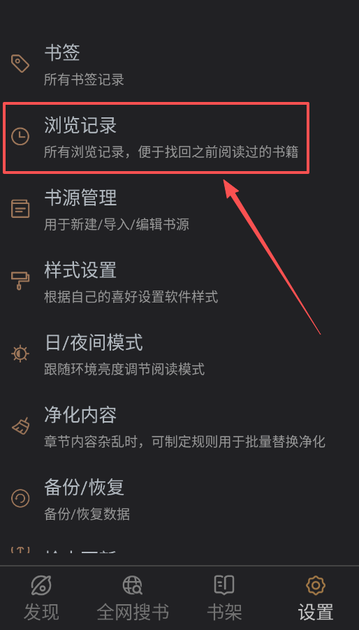 3、读过的内容不用担心忘记,在设置里的浏览记录和书签中都能轻松找到历史记录。