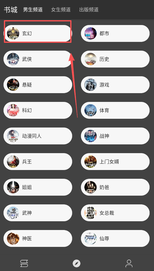 1、首先从书城开始选书,下面分类很全,比如玄幻类有武侠、悬疑、科幻,都市类有历史、游戏、战神,点进去就能找书看了。