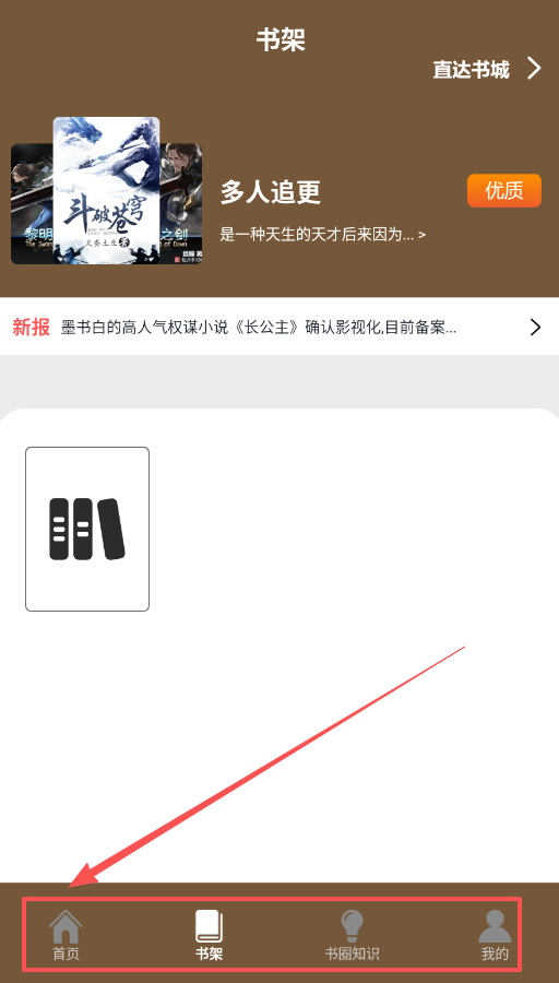 一、首次打开软件,先熟悉底部四个固定标签:首页、书架、书圈知识、我的。