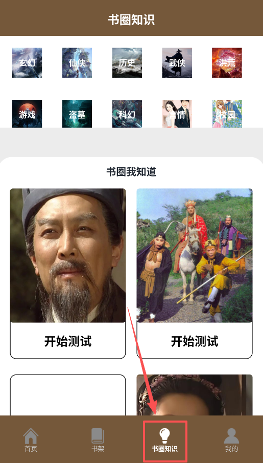 三、“书圈知识”不仅是分类目录,还有互动环节,点击“开始测试”,软件可能会通过几个小问题,来猜测你喜欢的书籍风格。