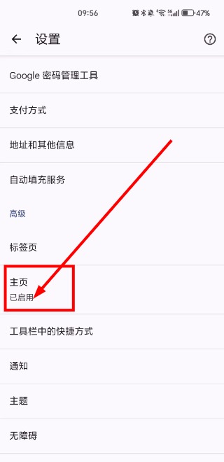 3、在设置页面找到【主页】选项并点击,进入主页设置界面,能对浏览器主页进行个性化配置。