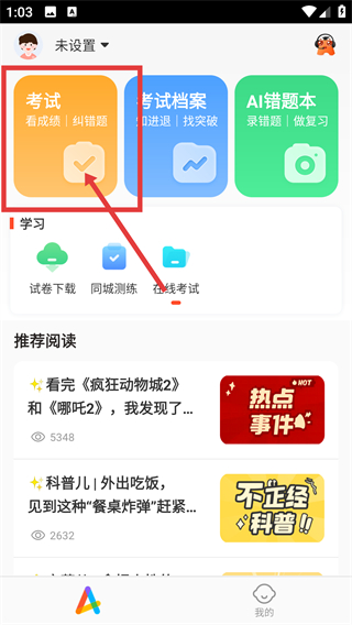 1、在主页点【考试】选项,能进入成绩查询相关界面,后续需绑定学生信息才能查看成绩哦。