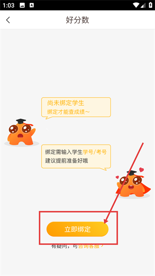 2、进入后会提示尚未绑定学生,点【立即绑定】按钮,就能进入绑定方式选择界面啦。
