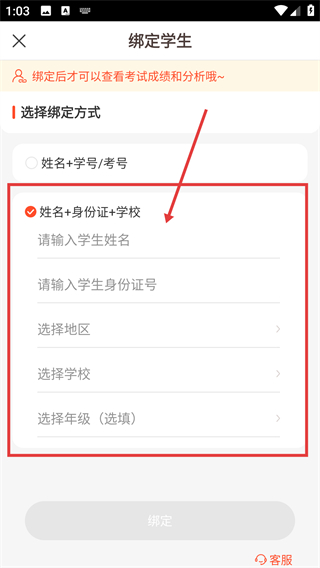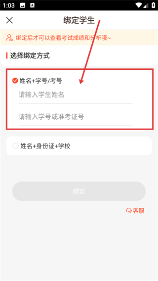 3、选【姓名+学号/考号】的绑定方式,填好学生姓名和学号/考号,就能完成初步绑定啦。