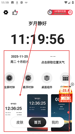 1、在应用首页,能看到时间、日期等信息,还有【全屏时钟】【悬浮时钟】等功能选项,可按需选择使用哦。