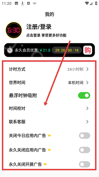 3、在“我的”页面里,有【计时方式】【时间校对】等选项,可自定义时钟的显示和功能模式呢。