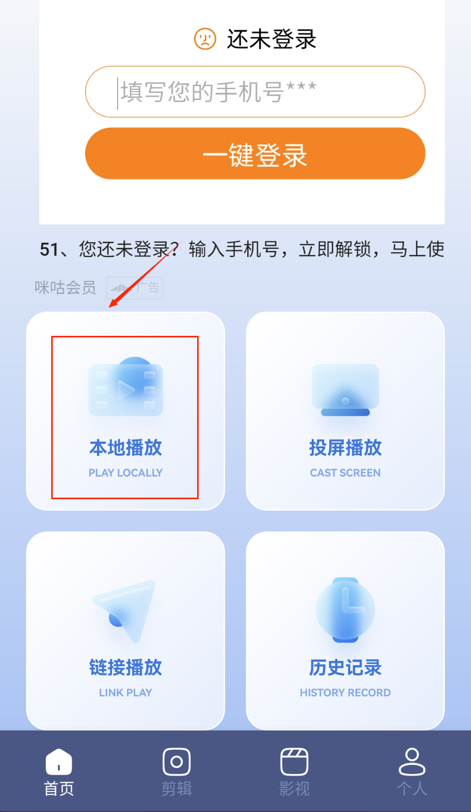 2、想播放本地视频时返回首页并点击本地播放按钮,软件会自动扫描手机中的视频文件,选择想看的视频即可开始播放。