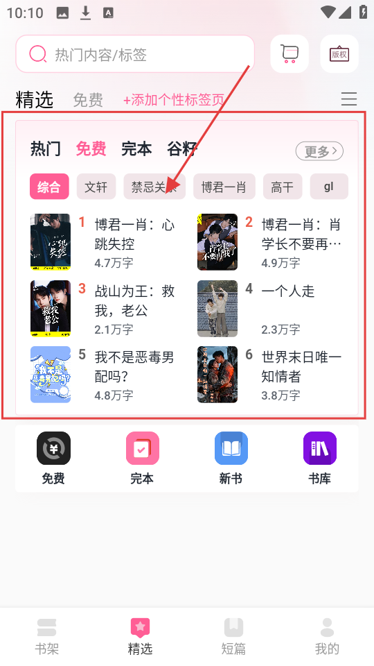 1、在软件精选页面,可选择热门、免费等分类,查看各类书籍列表,找到感兴趣的书籍啦。