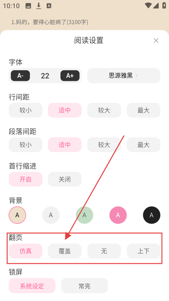 4、在阅读设置页面,就可以选择翻页方式,打造舒适阅读体验哦。