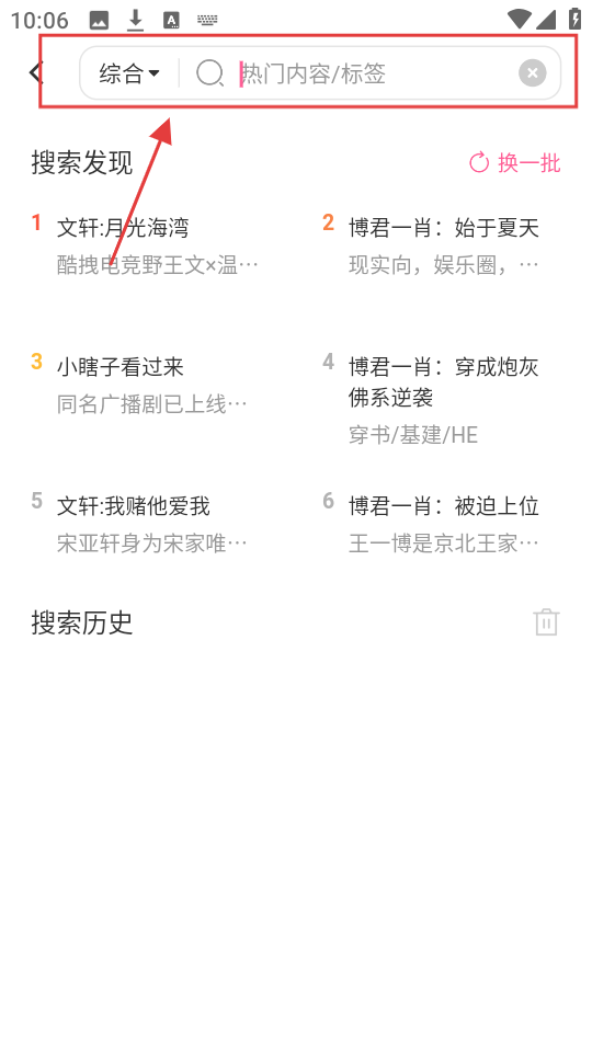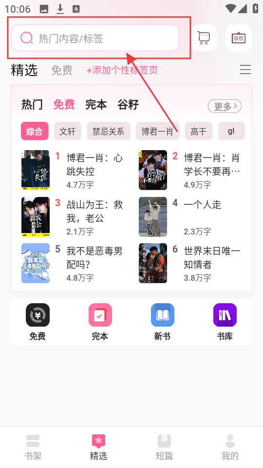 1、点顶部搜索框,输入喜欢的内容或标签,就能搜索到相关小说,快去试试吧。