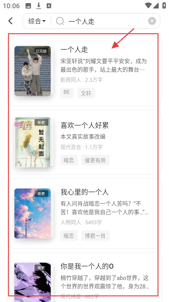 3、搜索结果里选心仪的小说,比如《一个人走》,点进去看详情哦。