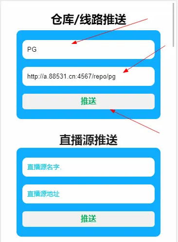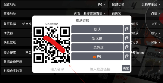 5、扫码后,会看下如下界面,填写播放源地址,名称用于标识,URL要填实际的播放源URL地址,然后点击推送,看下电视端的TVBOX扫码的右边就会出现刚推送的地址了,把需要播放的源地址全部推送到TVBOX,就可以选择来播放了。