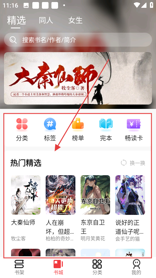 1、书城热门精选里选《大秦仙师》,进入详情页,了解小说信息哦。