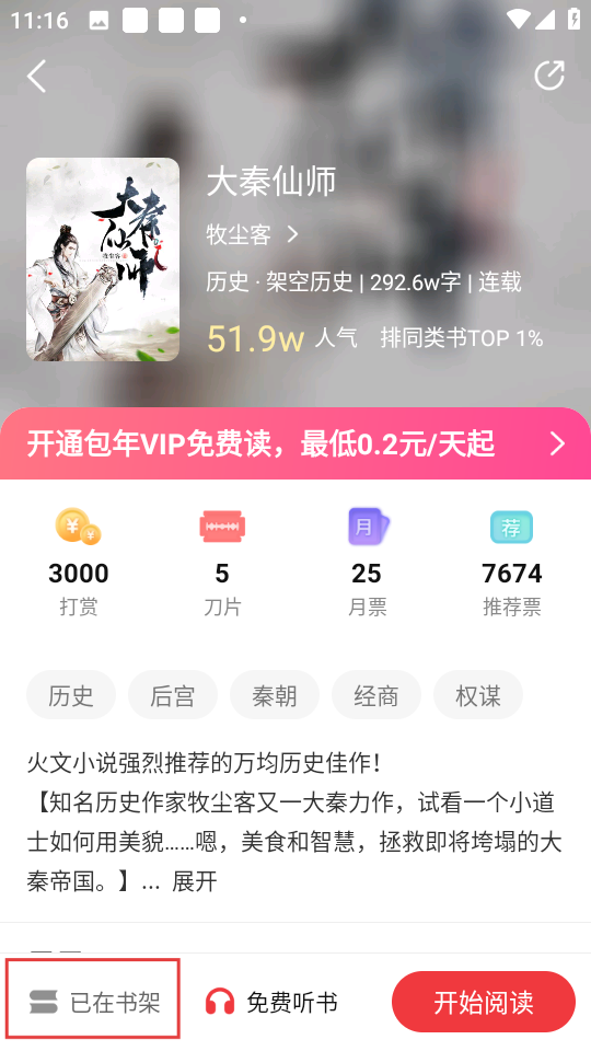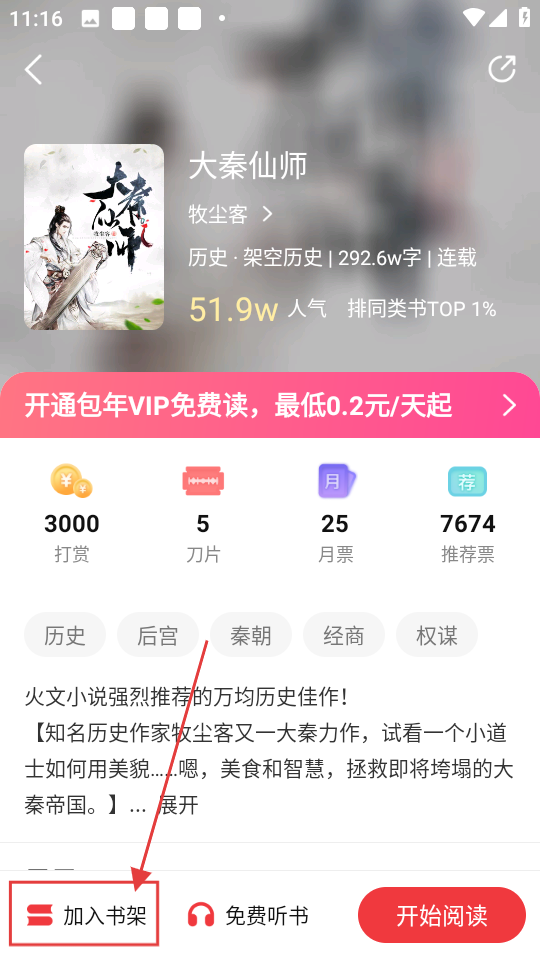 2、《大秦仙师》详情页点【加入书架】,将小说加入书架,方便后续阅读啦。