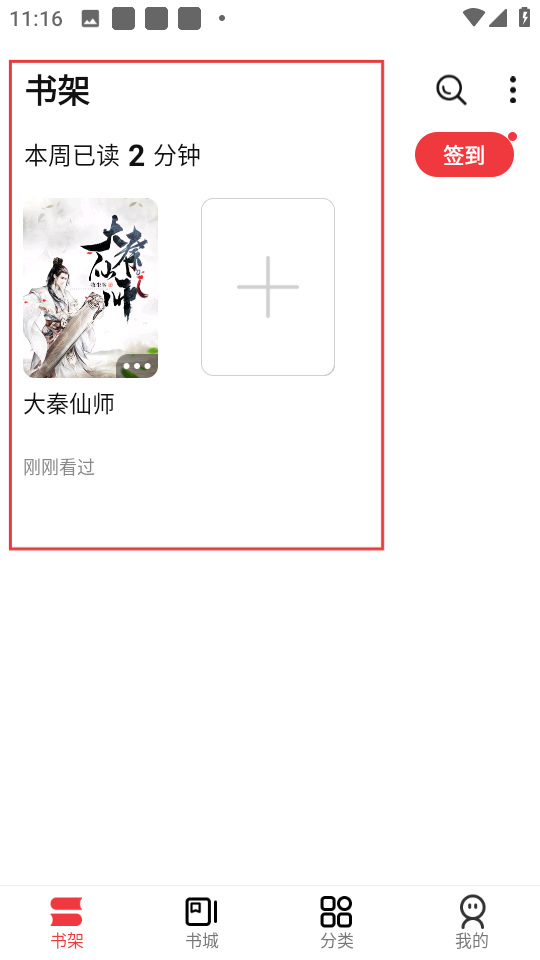 4、书架页可看到《大秦仙师》,随时可继续阅读,是不是很赞呀。