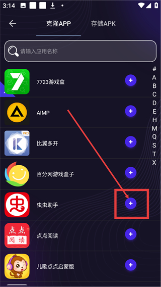 2、进入克隆APP页后,找到目标应用(如【虫虫助手】),点击右侧加号按钮就能添加克隆啦。