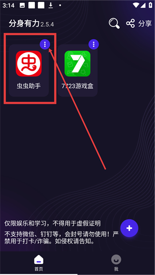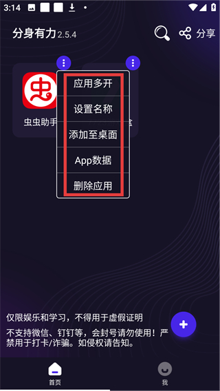 3、添加完成后返回首页,点击已克隆应用(如【虫虫助手】)右上角的三点按钮,可展开功能菜单哦。