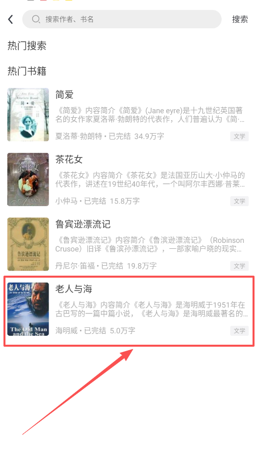 2、热门搜索区提供了精准的书籍推荐,老人与海、简爱等名著会直接显示简介和字数,方便你快速评估并决定是否加入书架阅读。