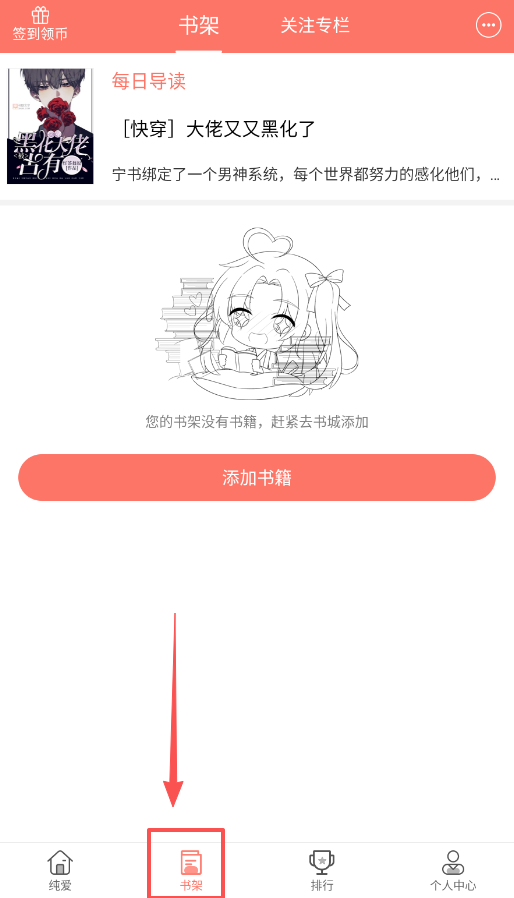 1、打开软件后,底部导航栏有五个主要入口,我们先看“书架”,点击它就可以直接跳转到书城去寻找资源了。